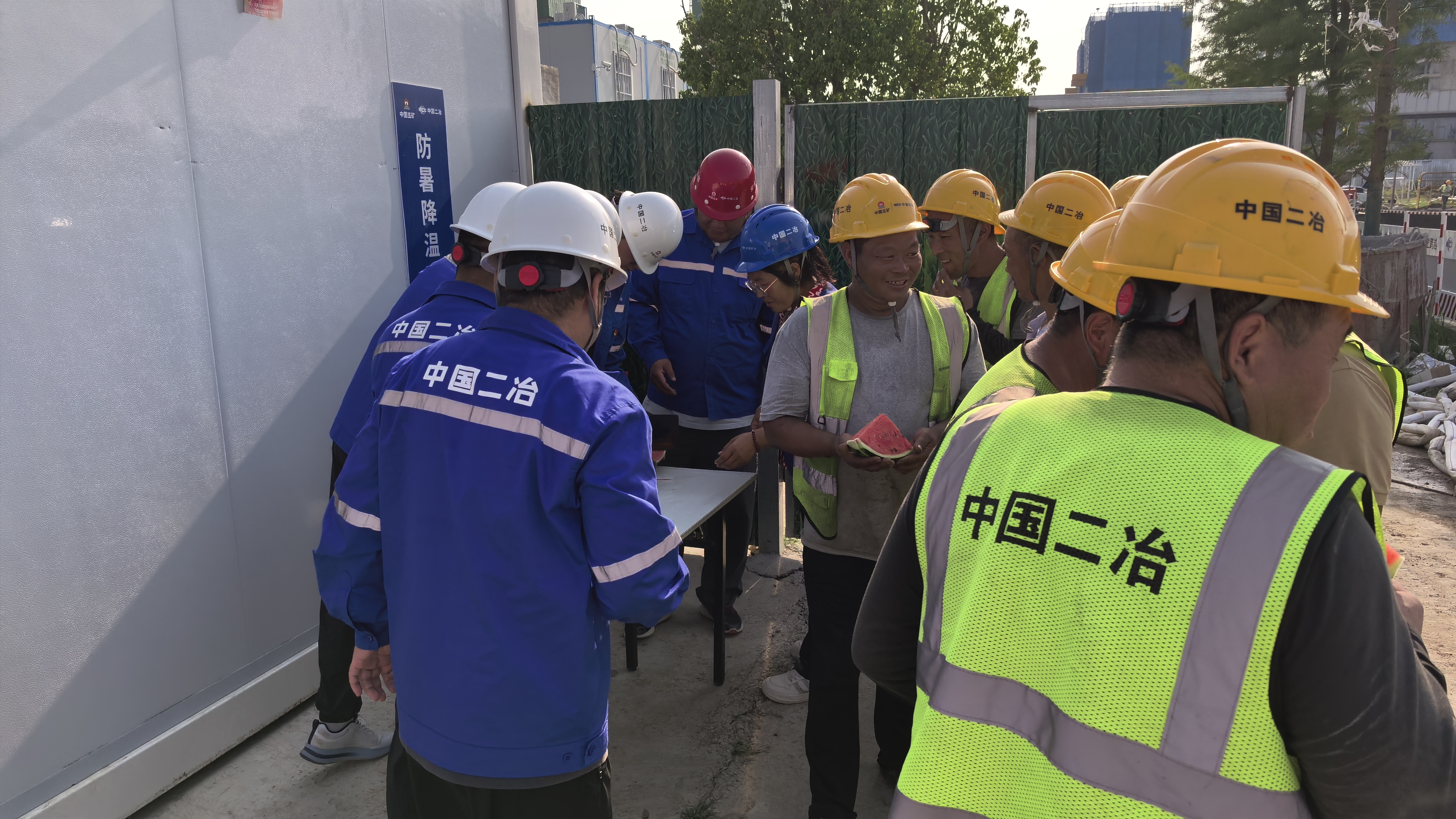 活動中,黨員志愿者們滿懷關(guān)切,將藿香正氣水、冰鎮(zhèn)西瓜等防暑降溫物品一一送到一線施工人員手中。并與工人們親切交流,關(guān)心他們的工作和生活情況,對大家不畏酷暑、堅守崗位,為項目建設辛勤付出的精神給予高度贊揚和衷心感謝。同時,反復叮囑工人們要做好防暑降溫措施,注意勞逸結(jié)合,合理調(diào)整作業(yè)時間,確保自身健康與施工安全。