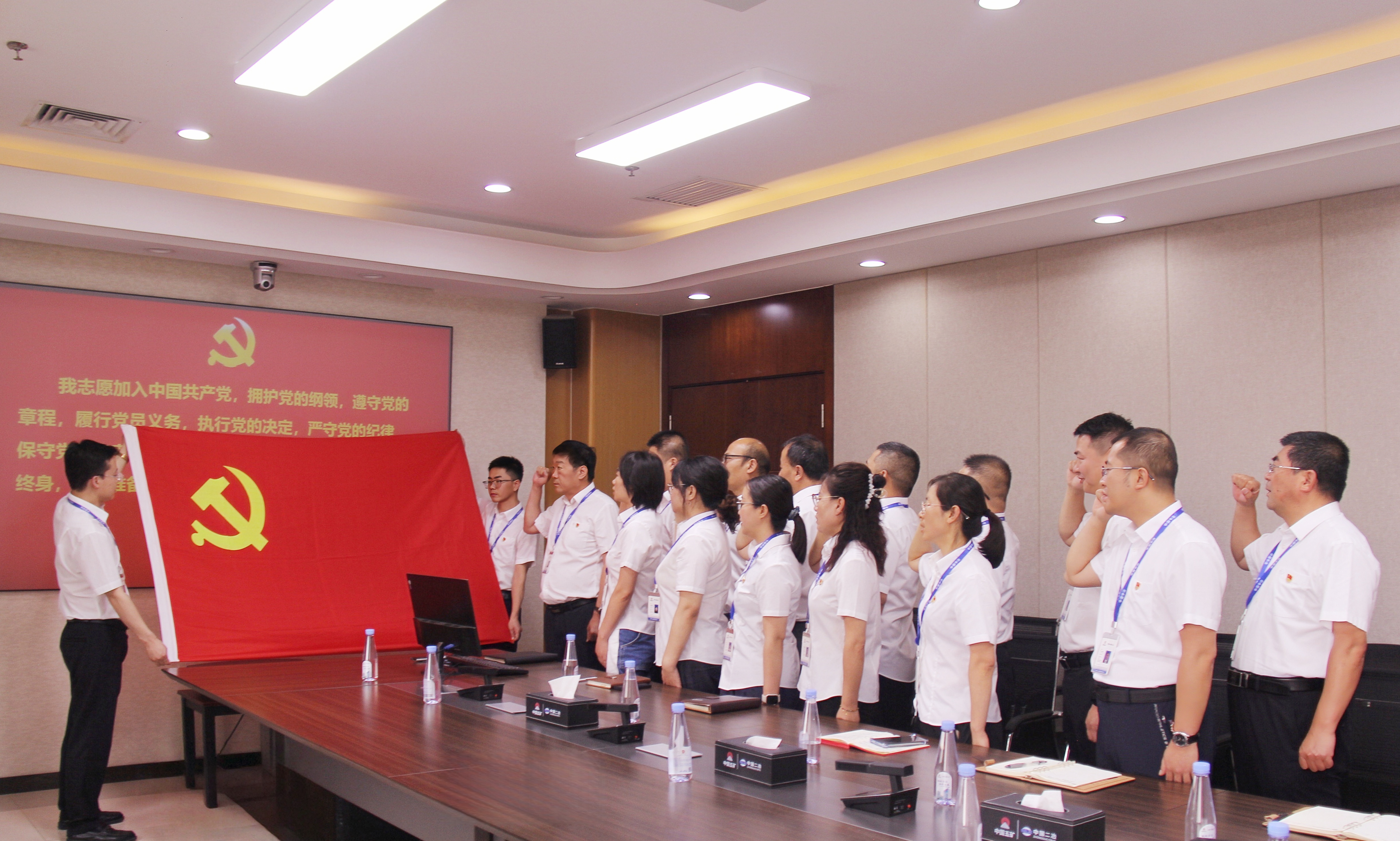 分公司機關(guān)黨支部全體黨員在領(lǐng)誓人的帶領(lǐng)下,整齊列隊,面對鮮紅的中國共產(chǎn)黨黨旗,高舉右拳,齊聲莊嚴(yán)宣誓。
