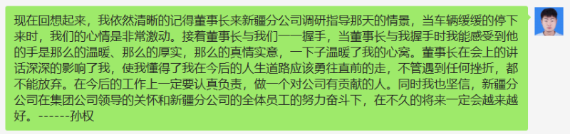 相聚的時(shí)間總是那么短暫,離別多少會(huì)伴有傷感。您知道嗎?有您陪伴的這一兩個(gè)小時(shí),興奮而又溫馨,它曾承載著無(wú)數(shù)新疆分公司職工多年來(lái)的夢(mèng)想。您說(shuō),如果有機(jī)會(huì),這個(gè)冬季我們還可以見面,如果工作繁忙,最遲明年也一定會(huì)抽時(shí)間再來(lái)看我們。我們“拉鉤鉤”,這將成為我們之間的約定,相信下次見面時(shí),我們都會(huì)是更好的模樣。