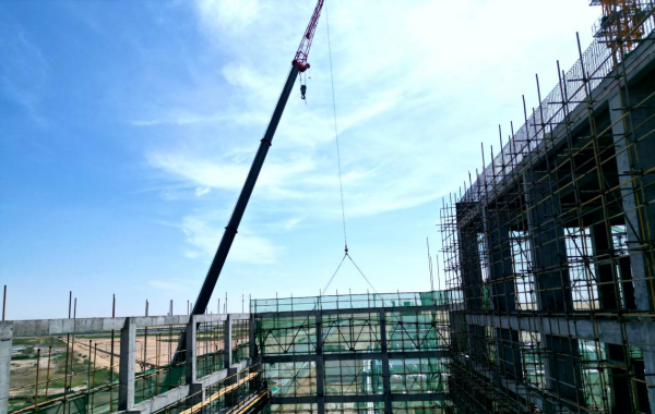 本次吊裝的鋼屋架跨度18米、梁高2.9米,距地面 18.85米,單榀重量達1.5噸。面對高溫天氣及吊裝區(qū)域環(huán)境復雜、空間狹小,土建與安裝作業(yè)交叉等多重挑戰(zhàn),項目部全員堅守崗位,一方面對現(xiàn)場管理人員與作業(yè)人員進行周密分工,圍繞施工方法、安全操作規(guī)程等內容開展多輪詳細培訓;另一方面在高溫條件下多次組織勘查吊裝位置、規(guī)劃吊裝路徑、優(yōu)化吊裝方案,全過程嚴把安全與質量關,確保各工序嚴格按方案推進。
