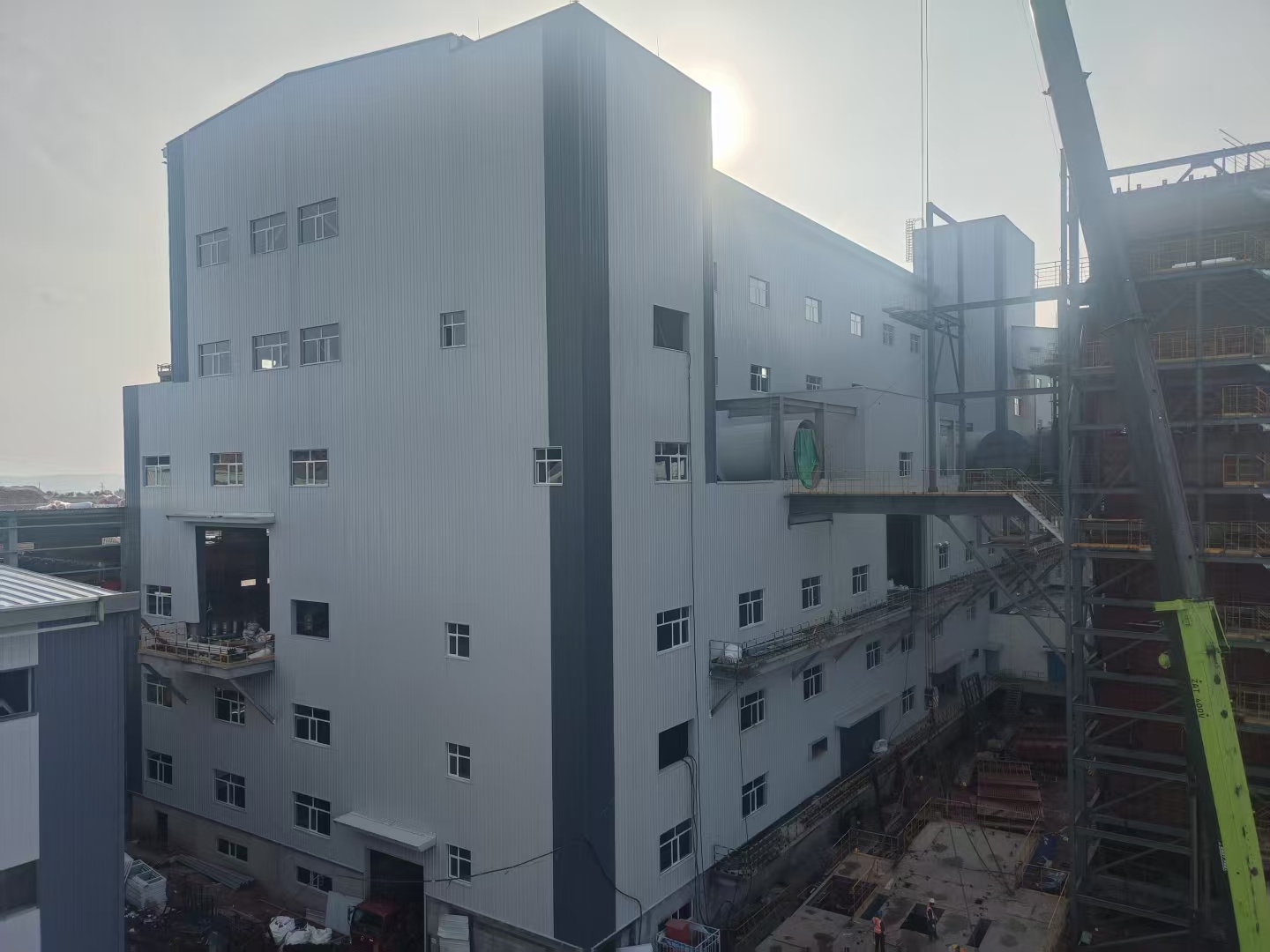 匯能硅鋁項目緊扣國家“雙碳”目標(biāo),將綠色理念融入發(fā)展實踐,持續(xù)探索以生態(tài)“含綠量”撬動發(fā)展“含金量”。其中,礦熱還原工程建筑面積4891平方米,長146米,寬33.5米,高45米,六層鋼結(jié)構(gòu),是本項目最大的主廠房。施工過程中,針對礦熱還原工程施工戰(zhàn)線長、混凝土澆筑體量大、施工工藝復(fù)雜等攔路虎,項目部團(tuán)隊提前優(yōu)化施工組織設(shè)計和施工方案,強(qiáng)化質(zhì)量巡檢、材料進(jìn)場檢驗、安全每日監(jiān)管頻率,通過分區(qū)突擊、“土建+專業(yè)”工序有效銜接、增派專業(yè)隊伍、實施進(jìn)度日考核等舉措,集中優(yōu)勢資源攻堅推進(jìn),確保礦熱還原基礎(chǔ)在26天內(nèi)完成,主體結(jié)構(gòu)177天完成,跑出施工加速度。在此基礎(chǔ)上,項目部搶抓黃金施工期,節(jié)假日不停步,提前完成二次維護(hù)、裝飾裝修等關(guān)鍵節(jié)點,土建工程就此全面完成。