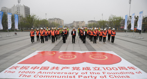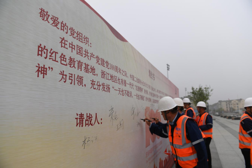 在學(xué)黨史、悟思想環(huán)節(jié)中,建設(shè)者們在中國二冶承建并完成的湖州市練市鎮(zhèn)振興廣場上重溫入黨誓詞,堅(jiān)定作為一名共產(chǎn)黨員的理想信念;向黨員突擊隊(duì)和青年突擊隊(duì)授旗,突擊隊(duì)代表表達(dá)了“堅(jiān)決聽黨指揮,踐行初心使命,認(rèn)真履職盡責(zé),勇于擔(dān)當(dāng)作為”的決心;在全體職工簽名的請戰(zhàn)書中,立下了“作為浙江湖州片區(qū)的建設(shè)者,承諾以開天辟地、敢為人先的紅船精神為引領(lǐng),充分發(fā)揚(yáng)‘一天也不耽誤,一天也不懈怠’ 的中冶精神,以高度的責(zé)任感和使命感踐行央企責(zé)任擔(dān)當(dāng),履行光榮使命。”的錚錚誓言。 活動(dòng)中,全體職工合唱《唱支山歌給黨聽》,用歌聲緬懷歷史、展望未來、傳承“紅船精神”,歌聲催人奮進(jìn),氣勢振奮人心。在大氣磅礴的歌聲和旋律中,感受到中國二冶職工對黨和國家的熱愛,感受到中華民族滄桑歷史,感受到二冶人昂揚(yáng)的斗志。在弘揚(yáng)愛國精神,重溫紅色經(jīng)典的同時(shí),號召大家把如火的熱情投入到工作中去,不忘初心,砥礪前行,以優(yōu)異的成績迎接中國共產(chǎn)黨成立100周年。