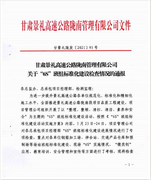 為進(jìn)一步提升景禮高速公路各單位規(guī)范化、標(biāo)準(zhǔn)化和精細(xì)化施工水平,全面推進(jìn)景禮高速公路隴南段項(xiàng)目品質(zhì)工程建設(shè),春節(jié)過后,隴南段項(xiàng)目管理公司組織開展了以“整理、整頓、清掃、清潔、素養(yǎng)、安全”為主題的“6S”班組標(biāo)準(zhǔn)化建設(shè)活動,按照《“6S”班組標(biāo)準(zhǔn)化建設(shè)活動實(shí)施方案》內(nèi)容。