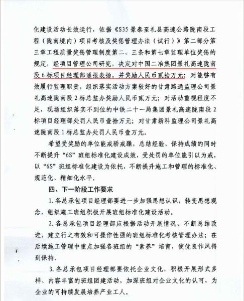 景禮項(xiàng)目部精心組織,合理安排,認(rèn)真組織實(shí)施。5月23日-24日,項(xiàng)目管理公司對各總承包項(xiàng)目經(jīng)理部“6S” 班組標(biāo)準(zhǔn)化建設(shè)進(jìn)展情況進(jìn)行了專項(xiàng)檢查,重點(diǎn)檢查了鋼筋加工場、拌合站、交通產(chǎn)品倉庫和預(yù)制場等場站班組標(biāo)準(zhǔn)化建設(shè)、現(xiàn)場“6S” 實(shí)施情況、“微 改創(chuàng)”應(yīng)用、教育培訓(xùn)、安全管理和宣傳等方面。依據(jù)《S35 景泰至禮縣高速公路隴南段工程(隴南境內(nèi))項(xiàng)目考核及獎(jiǎng)懲管理辦法(試行)》第二部分第三章工程質(zhì)量獎(jiǎng)懲管理制度第二、三條和第七章監(jiān)理單位獎(jiǎng)懲的規(guī)定,經(jīng)項(xiàng)目管理公司研究,決定對中國二冶集團(tuán)景禮高速隴南段6標(biāo)項(xiàng)目經(jīng)理部通報(bào)表揚(yáng),并獎(jiǎng)勵(lì)人民幣貳拾萬元。