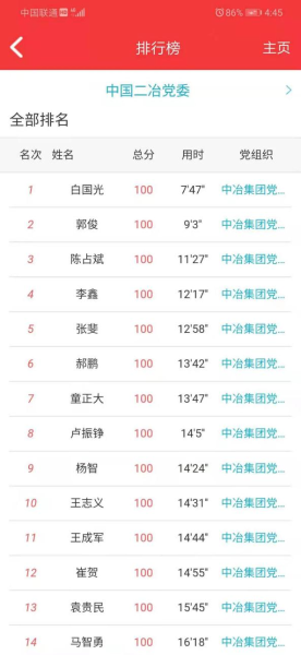本次黨史知識(shí)競(jìng)賽,內(nèi)容涵蓋了習(xí)近平《論中國(guó)共產(chǎn)黨歷史》、《毛澤東、鄧小平、江澤民、胡錦濤關(guān)于中國(guó)共產(chǎn)黨歷史論述摘編》、《習(xí)近平新時(shí)代中國(guó)特色社會(huì)主義思想學(xué)習(xí)問(wèn)答》、《中國(guó)共產(chǎn)黨簡(jiǎn)史》等黨史內(nèi)容。競(jìng)賽依托五礦智慧黨建app平臺(tái)進(jìn)行,競(jìng)賽共300道試題,包括單項(xiàng)選擇、多項(xiàng)選擇。在競(jìng)賽時(shí)間內(nèi)可以隨時(shí)參與答題。后臺(tái)會(huì)根據(jù)答題的正確率由高到低進(jìn)行排列,正確率相同的,將已答題用時(shí)進(jìn)行排序。在答題競(jìng)賽中,每位黨員積極思考,認(rèn)真答題,踴躍參與,不少黨員紛紛表示,通過(guò)這個(gè)知識(shí)競(jìng)賽,使黨史、黨章、黨規(guī)都印在腦海里,理解也深刻。希望公司今后能多舉辦類似活動(dòng),提升黨員政治理論知識(shí)與黨員思想覺(jué)悟能力,爭(zhēng)做優(yōu)秀共產(chǎn)黨員。本次黨史知識(shí)競(jìng)賽活動(dòng),公司共有1560名黨員干部踴躍參加,經(jīng)過(guò)激烈角逐,來(lái)自四川分公司的白國(guó)光以7分47秒的優(yōu)異成績(jī)?nèi)〉脻M分,獲得本次競(jìng)賽活動(dòng)的一等獎(jiǎng);來(lái)自市政分公司的郭俊等5名黨員獲得二等獎(jiǎng);來(lái)自華東分公司的王成軍等10名黨員獲得三等獎(jiǎng);來(lái)自甘肅分公司的高國(guó)義等30名黨員獲得優(yōu)秀獎(jiǎng)。