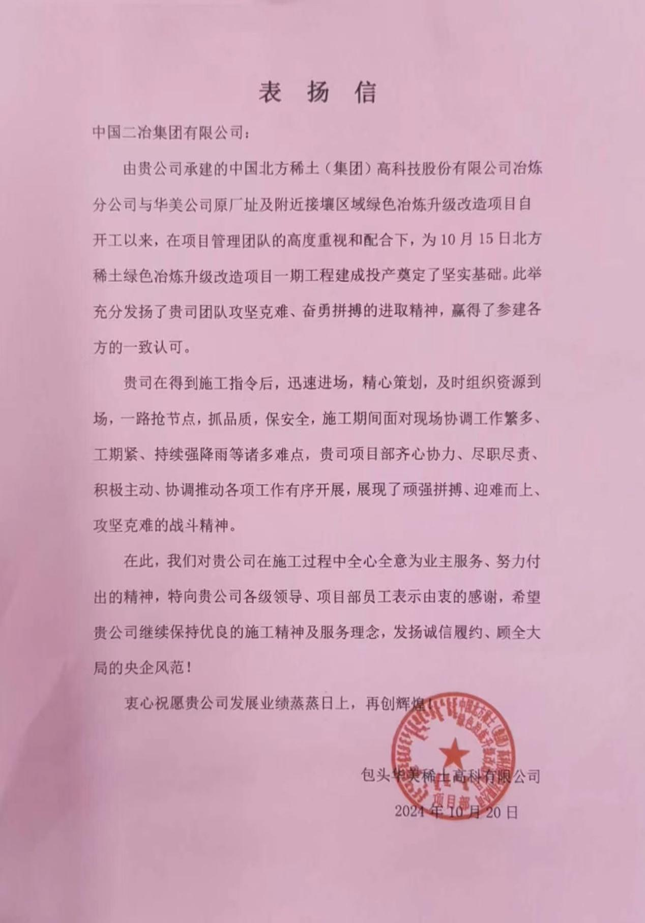 10月23日,中國二冶收到包頭華美稀土高科有限公司表揚(yáng)信,對中國二冶承建的中國北方稀土(集團(tuán))高科技股份有限公司冶煉分公司與華美公司原廠址及附近接壤區(qū)域綠色冶煉升級(jí)改造項(xiàng)目在施工過程中秉持敬業(yè)精神、盡心竭力為業(yè)主服務(wù)表示由衷感謝。