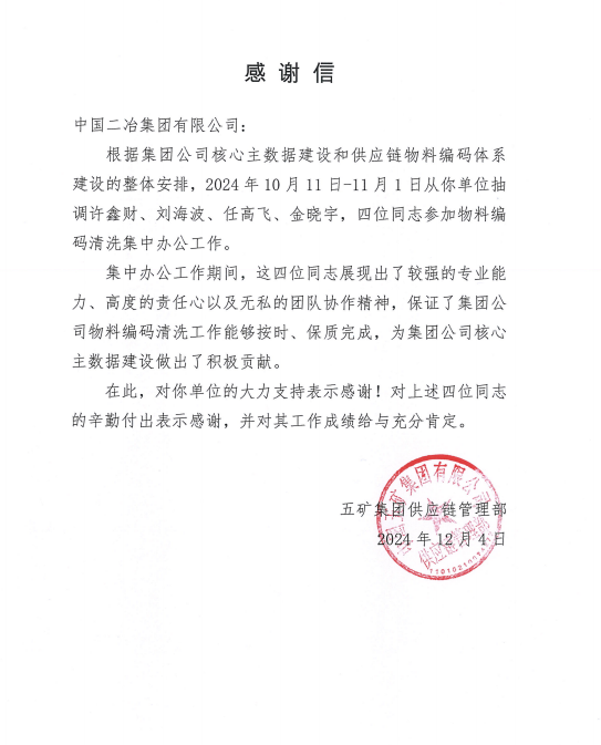 信中指出,根據集團公司核心主數據建設和供應鏈物料編碼體系建設的整體安排,2024年10月11日-11月1日從你單位抽調許鑫財、劉海波、任高飛、金曉宇,四位同志參加物料編碼清洗集中辦公工作。集中辦公工作期間,這四位同志展現出了較強的專業(yè)能力、高度的責任心以及無私的團隊協(xié)作精神,保證了集團公司物料編碼清洗工作能夠按時、保質完成,為集團公司核心主數據建設做出了積極貢獻。