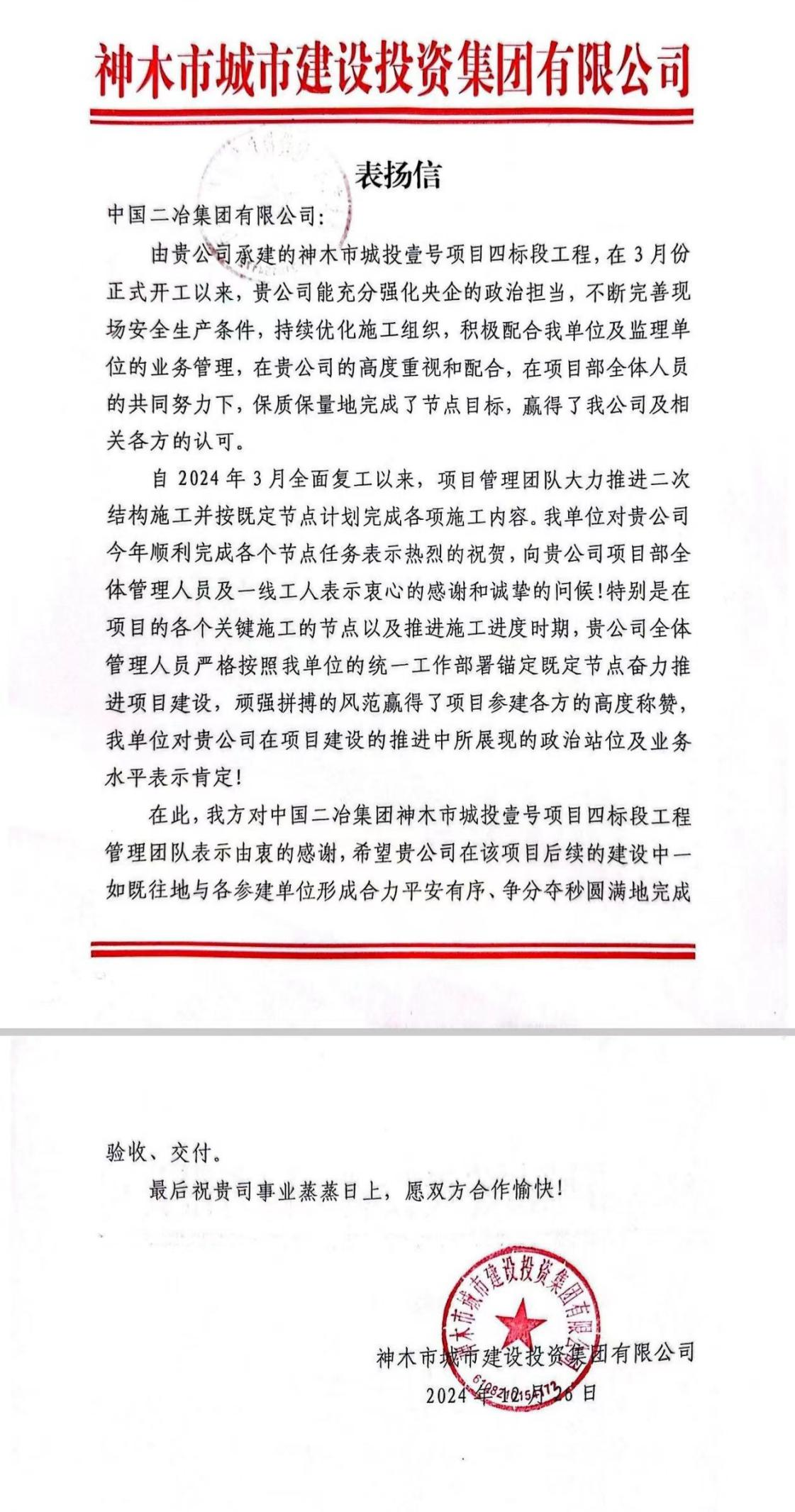 神木市城市建設投資集團有限公司在表揚信中提到:中國二冶項目管理團隊在神木城投壹號項目建設過程中充分發(fā)揮央企擔當,不斷完善安全生產(chǎn)條件,優(yōu)化施工組織設計,保質保量完成項目二次結構及其他施工內(nèi)容。神木市城投壹號項目位于神木市東興街以西,四支河路以北麟州路以東后坡路以南,總建筑面積3.5萬平方米。作為神木市重要民生工程之一,該項目從開工建設以來,全體參建人員就以“起步就是沖刺,開局就是決戰(zhàn)”的拼搏姿態(tài),緊密配合,攻堅克難,嚴格按照進度計劃進行施工,做到了抓安全堅持不懈、抓質量堅定不移、抓進度毫不動搖,高質量高效率完成履約節(jié)點,用實力跑出二冶速度。
