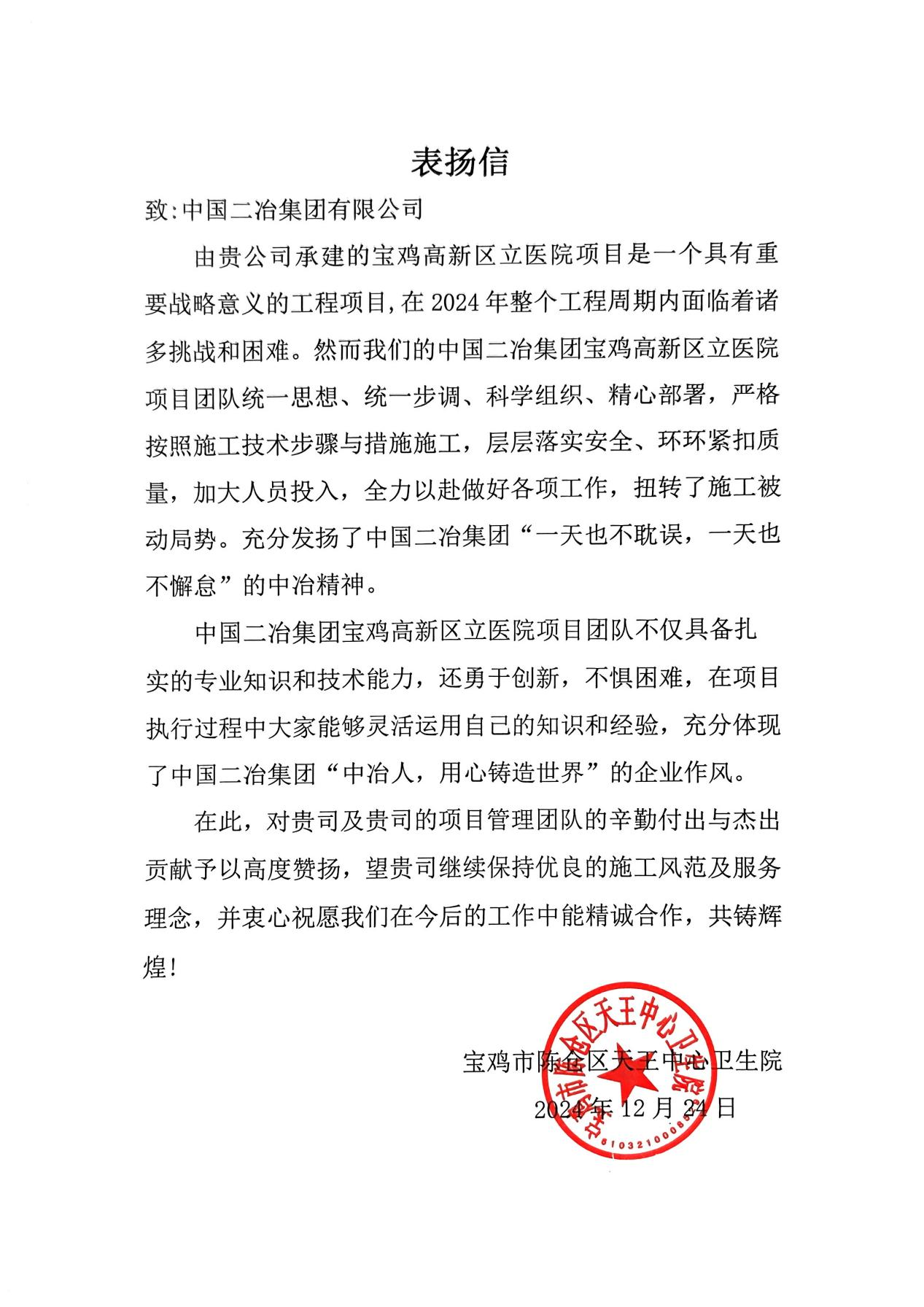 寶雞市陳倉區(qū)天王中心衛(wèi)生院來信對中國二冶寶雞高新區(qū)立醫(yī)院項目管理團隊的辛勤付出與杰出貢獻予以高度贊揚。在2024年建設過程中,項目面臨著諸多的困難和挑戰(zhàn),項目部全體人員統(tǒng)一思想、統(tǒng)一步調、科學組織、精心部署,層層落實安全、環(huán)環(huán)緊扣質量、全力以赴做好項目建設各項工作,扭轉了施工被動局勢,項目團隊不僅具備扎實的專業(yè)知識和技術能力,還勇于創(chuàng)新,不懼困難,充分體現(xiàn)了中國二冶“共建一流項目 合創(chuàng)品牌價值”的企業(yè)經(jīng)營理念。寶雞高新區(qū)立醫(yī)院項目是“十四五”期間寶雞市重點項目,是一所集醫(yī)療、教學、科研、預防、保健、康復于一體的綜合性三級甲等綜合醫(yī)院,建成后將提高寶雞市高新區(qū)區(qū)域衛(wèi)生服務水平,極大緩解寶雞市東部和南部區(qū)域醫(yī)療資源不足的局面。