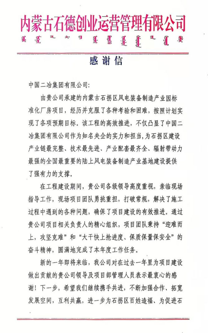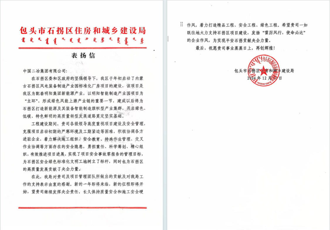 石拐區(qū)住建局在信中指出,內(nèi)蒙古石拐區(qū)風電裝備制造產(chǎn)業(yè)園標準化廠房項目是石拐區(qū)為配套明陽集團新能源產(chǎn)業(yè)形成綠色風能上游產(chǎn)業(yè)鏈的重要項目,在工程建設期間,中國二冶各級領導高度重視項目建設,項目管理克服項目啟動初期的嚴寒環(huán)境及工期緊迫等困難,勇?lián)厝巍⒖茖W籌劃、精心組織,有效推進項目進展,為石拐區(qū)的高質(zhì)量發(fā)展貢獻了央企力量。