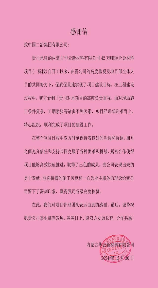 內(nèi)蒙古華云新材料有限公司在表揚信中指出,由中國二冶承建的內(nèi)蒙古華云三期42萬噸輕合金材料項目,在貴公司的高度重視及項目部全體人員的共同努力下,保質(zhì)保量地實現(xiàn)了項目建設目標,贏得相關方的高度稱贊。