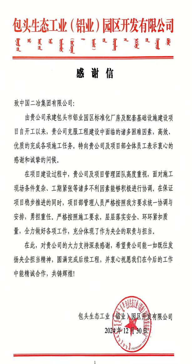 包頭市生態(tài)工業(yè)(鋁業(yè))園區(qū)開發(fā)有限公司在表揚信中指出,由貴公司承建包頭市鋁業(yè)園區(qū)一期標準化廠房及配套基礎設施建設項目自開工以來,貴公司克服工程建設中面臨的諸多困難因素,高效、優(yōu)質(zhì)地完成了各項施工任務。