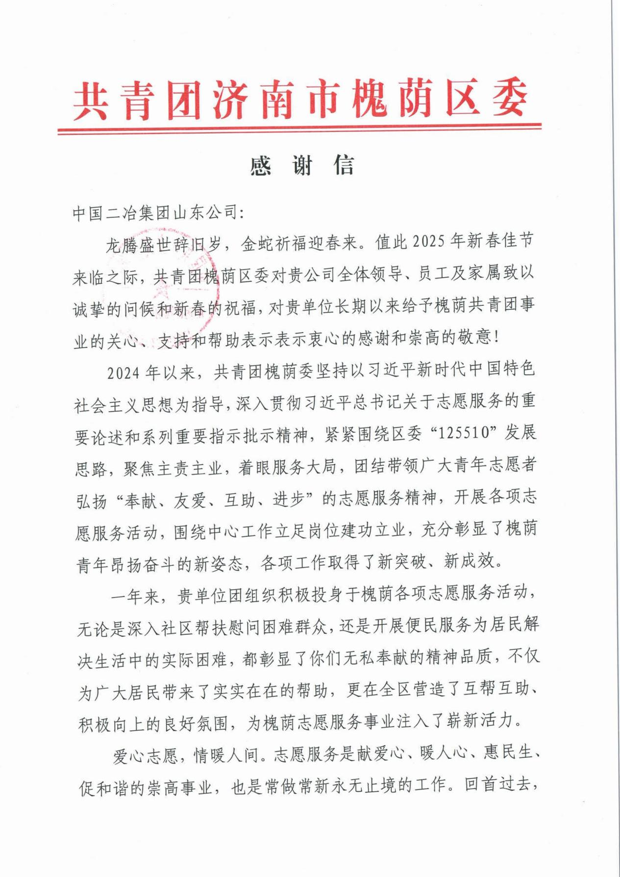 共青團(tuán)濟(jì)南市槐蔭區(qū)委在信中寫道,山東公司團(tuán)委積極投身于槐蔭各項(xiàng)志愿服務(wù)活動(dòng),無論是深入社區(qū)幫扶慰問困難群眾,還是開展便民服務(wù)為居民解決生活中的實(shí)際困難,彰顯了無私奉獻(xiàn)的精神品質(zhì),為廣大居民帶來了實(shí)實(shí)在在的幫助,更在槐蔭區(qū)營(yíng)造了互幫互助、積極向上的良好氛圍,為槐蔭志愿服務(wù)事業(yè)注入了嶄新活力。