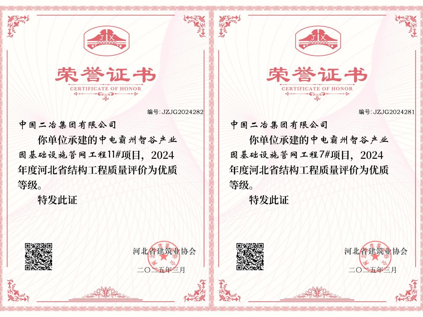 近日,中國二冶霸州中電智谷項目7#、11#樓獲評2024年度河北省優(yōu)質結構工程。