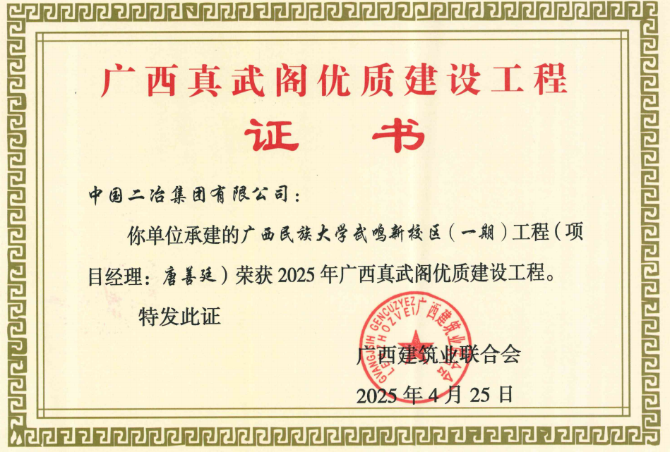 近日,廣西建筑業(yè)聯(lián)合會公布了2025年廣西建設(shè)工程“真武閣杯”獎(最高質(zhì)量獎)工程名單,中國二冶廣西民族大學(xué)武鳴新校區(qū)(一期)工程榮獲此獎項(xiàng)。