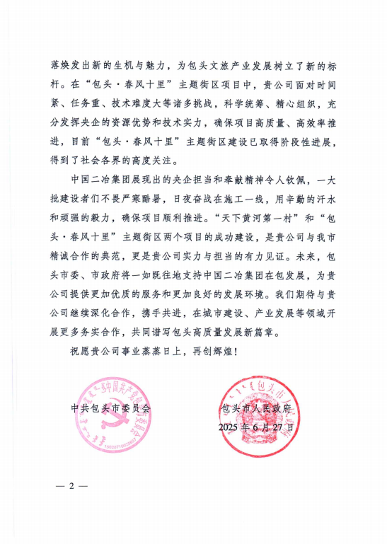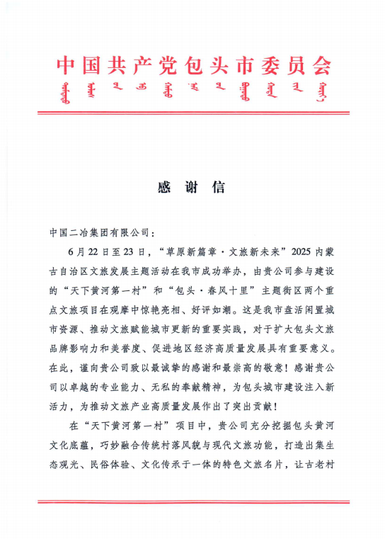 6月30日,中國二冶收到包頭市委、市政府發(fā)來的表揚信,對中國二冶在“天下黃河第一村”和“包頭?春風十里”兩大重點文旅項目建設中作出的卓越貢獻,給予高度贊譽。?