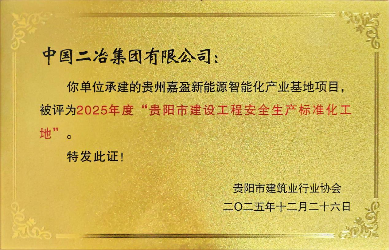 近日,中國二冶貴州嘉盈新能源智能化產(chǎn)業(yè)基地項目榮獲貴陽市建筑業(yè)行業(yè)協(xié)會頒發(fā)2025年度“貴陽市建設(shè)工程安全生產(chǎn)標(biāo)準(zhǔn)化工地”獎項。