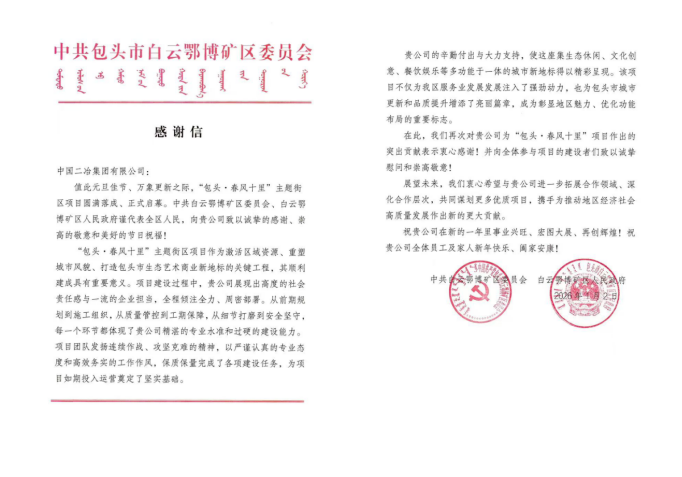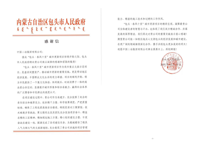 此次感謝及表揚(yáng),既是對中國二冶建設(shè)成果的高度認(rèn)可,也是對團(tuán)隊付出的充分信賴。未來,中國二冶將以此為激勵,持續(xù)深耕包頭城市建設(shè)領(lǐng)域,以更多優(yōu)質(zhì)精品工程賦能地方發(fā)展,為推動地區(qū)經(jīng)濟(jì)社會高質(zhì)量發(fā)展貢獻(xiàn)更大央企力量。