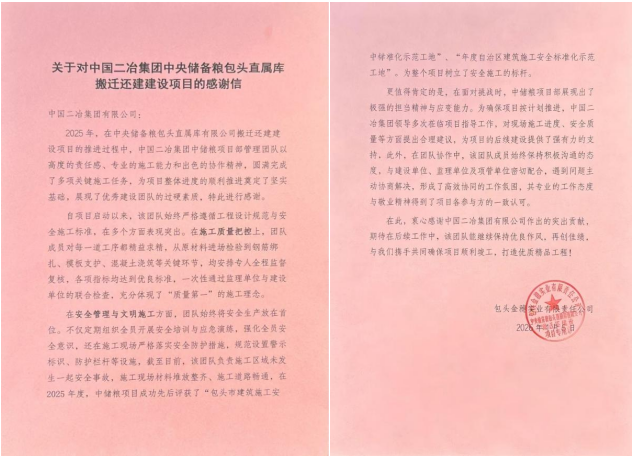 感謝信指出,在2025年項(xiàng)目推進(jìn)過(guò)程中,中國(guó)二冶中儲(chǔ)糧項(xiàng)目部管理團(tuán)隊(duì)以高度的責(zé)任感、專(zhuān)業(yè)的施工能力和出色的協(xié)作精神,圓滿完成了多項(xiàng)關(guān)鍵施工任務(wù),為項(xiàng)目整體順利推進(jìn)奠定了堅(jiān)實(shí)基礎(chǔ)。團(tuán)隊(duì)嚴(yán)格遵循設(shè)計(jì)規(guī)范與安全標(biāo)準(zhǔn),在施工質(zhì)量上精益求精,從原材料進(jìn)場(chǎng)到各關(guān)鍵工序均嚴(yán)格把控,一次性通過(guò)各項(xiàng)檢查,將“質(zhì)量第一”理念貫穿施工全流程。