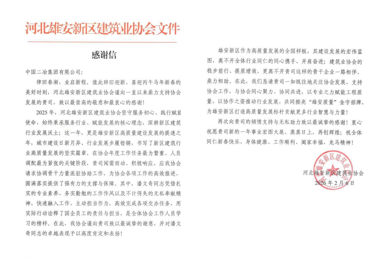 感謝信指出,中國二冶始終堅守初心、履職盡責(zé),在項目建設(shè)中搶工期、保質(zhì)量、守安全、促環(huán)保,不僅高效推進各項工程節(jié)點順利落地,更積極參與新區(qū)工程建設(shè)行業(yè)交流,主動分享建設(shè)經(jīng)驗,助力提升區(qū)域建筑業(yè)整體發(fā)展水平,為雄安新區(qū)大規(guī)模建設(shè)與高質(zhì)量發(fā)展注入了強勁動力,用實際行動生動詮釋了央企的責(zé)任與擔(dān)當(dāng)。