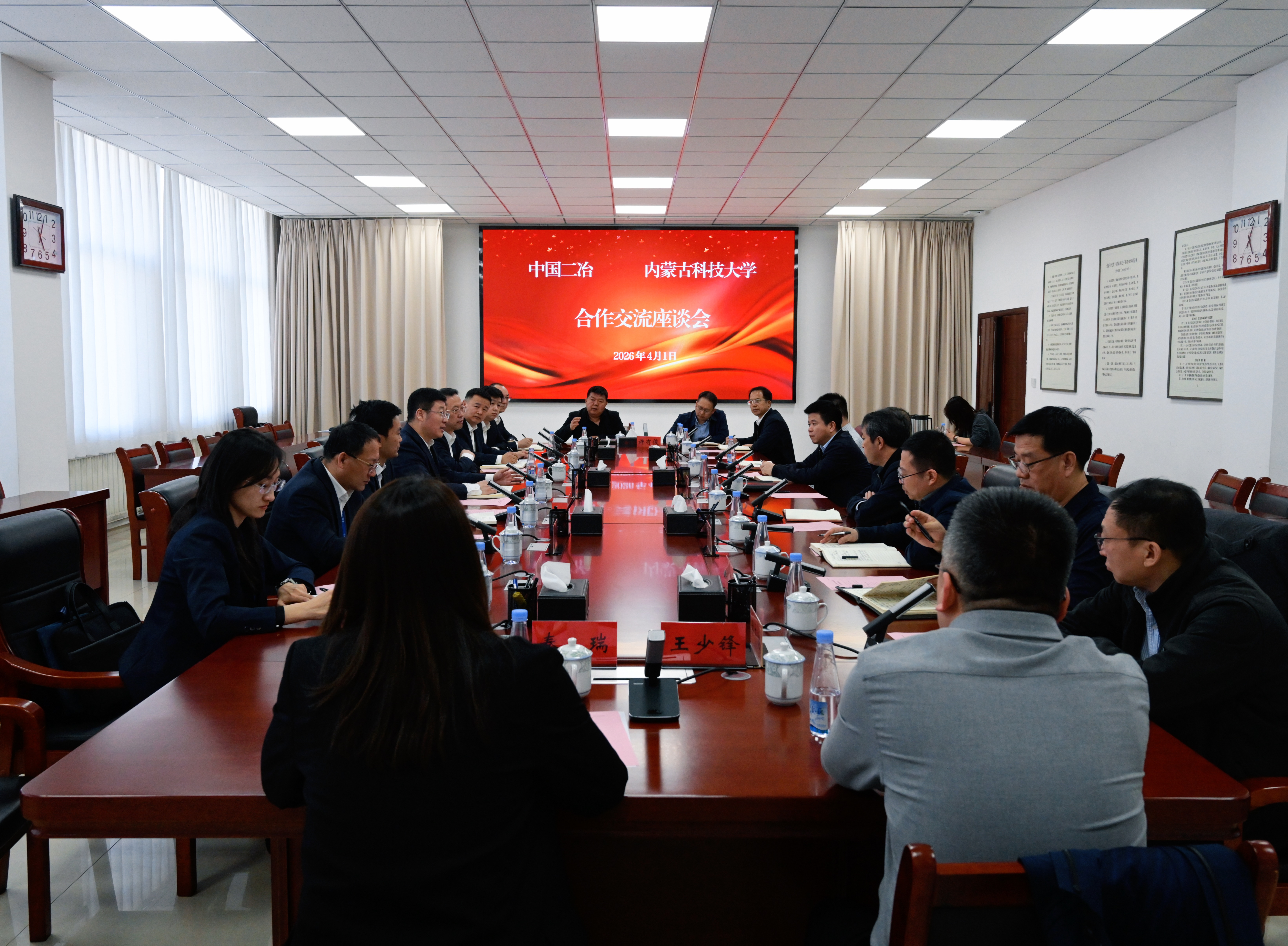 內(nèi)蒙古科技大學(xué)校長(zhǎng)助理劉承,相關(guān)學(xué)院院長(zhǎng)、處室處長(zhǎng)劉小勇,曹釗,張永強(qiáng),高峻峰,劉文,王少鋒,許有俊,王文明,秦瑞;中國(guó)二冶總部部門及二級(jí)公司負(fù)責(zé)人高盟、趙力欣、王志義、李曉明、韓慧超、尹力、李國(guó)強(qiáng)等參加會(huì)談。