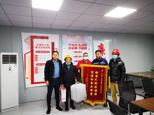 “感謝央企培養(yǎng)出這么好的員工!要不是你們拾金不昧、認(rèn)真負(fù)責(zé),那我們欄目損失可就大了!中國二冶好樣的,不愧是央企!這次失而復(fù)得,使我真切感受到中國二冶作為央企的責(zé)任擔(dān)當(dāng)。”隨后,欄目組工作人員將一面印著“拾金不昧好榜樣,傳遞社會正能量”的錦旗送到項(xiàng)目負(fù)責(zé)人手中,并要給項(xiàng)目部一些酬謝,項(xiàng)目負(fù)責(zé)人婉言拒絕。