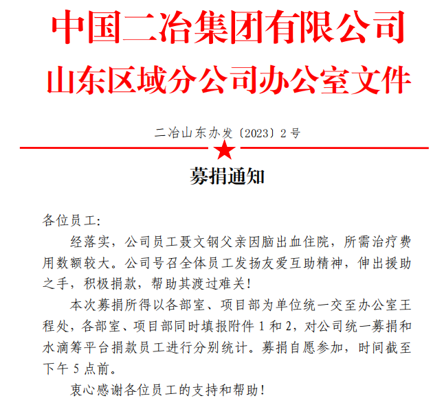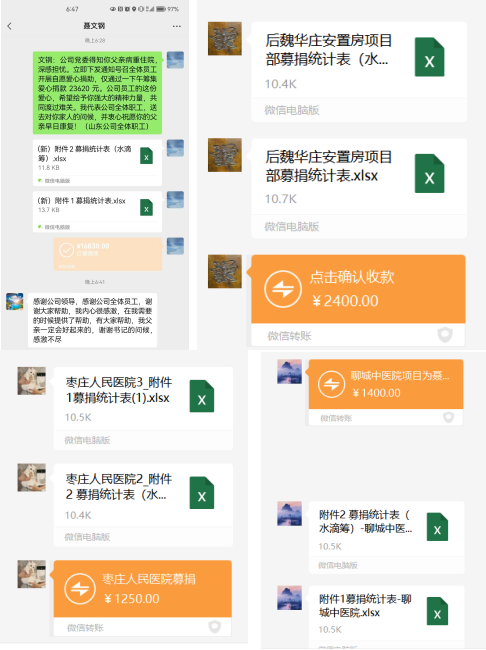 4月21日,在山東分公司工作群中,隨著一份募捐通知的下發(fā),機(jī)關(guān)各部門、各項(xiàng)目部干部員工紛紛行動(dòng),為分公司曹縣安置房項(xiàng)目員工聶文鋼的父親進(jìn)行愛(ài)心募捐。
