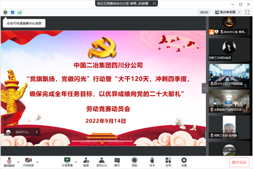 9月14日,四川分公司召開“黨旗飄揚、黨徽閃光”行動暨“大干 120 天、沖刺四季度,確保完成全年任務(wù)目標(biāo),以優(yōu)異成績向黨的二十大獻禮”勞動競賽動員會,分公司黨委書記劉喆作動員講話并主持會議,公司副總經(jīng)濟師、四川分公司總經(jīng)理鮑文明宣布勞動競賽啟動。