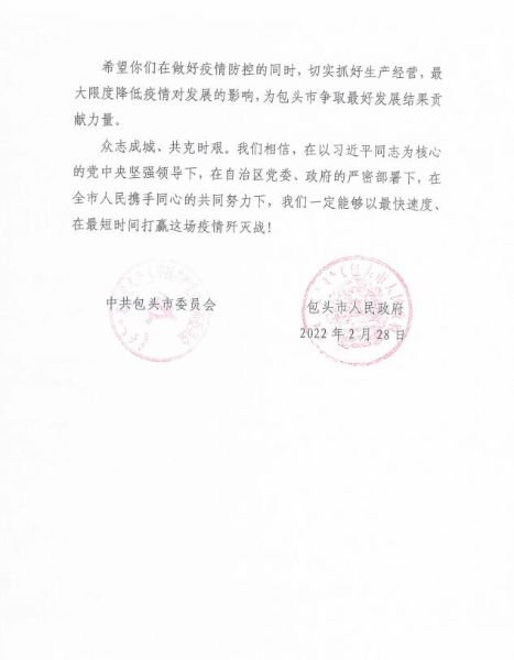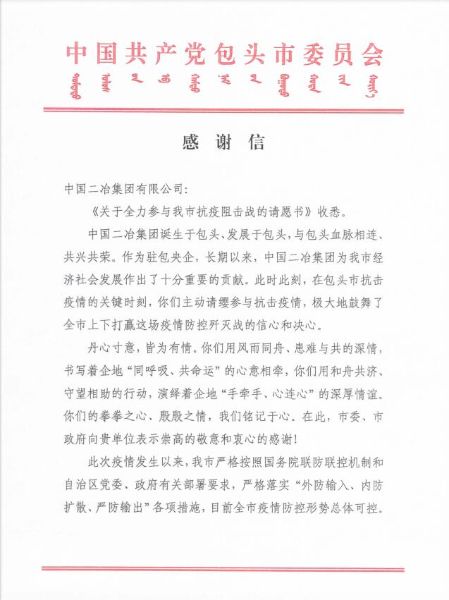感謝信中指出,中國二冶集團誕生于包頭、發(fā)展于包頭,與包頭血脈相連、共興共榮。作為駐包央企,長期以來,中國二冶集團為包頭市經濟社會發(fā)展作出了十分重要的貢獻。在包頭市抗擊疫情的關鍵時刻,主動請纓參與抗擊疫情,極大地鼓舞了全市上下打贏這場疫情防控殲滅戰(zhàn)的信心和決心。
